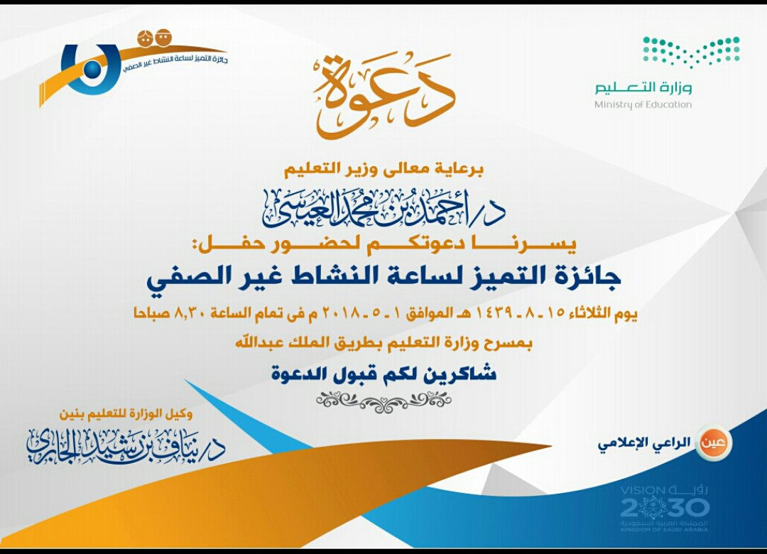 جائزة التميز لساعة النشاط. جائزة التميز لساعة النشاط اللاصفي pdf 375 33 kb تنقل سريع نظام الدعم الفني و المساعدة. دعا وزير التعليم الدكتور أحمد العيسى المعلمين والمعلمات الذين شاركوا في ساعة النشاط لهذا العام بالتسجيل في جائزة التميز لساعة النشاط الحر لإبراز مشروعاتهم التي أبدعوا فيها على الرابط التالي. جائزة التميز لساعة النشاط جائزة التميز لساعة النشاط جائزة التميز لساعة النشاط جائزة التميز لساعة النشاط لمشاهدة و تحميل الملفات اضغط هنا. جائزة التميز لساعة النشاط اللاصفي.